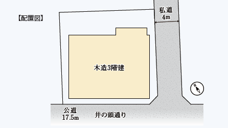 | 接 道 | 南側幅員約17.5m公道、東側幅員約4.0m私道 | 建物構造 | 木造3階建 |